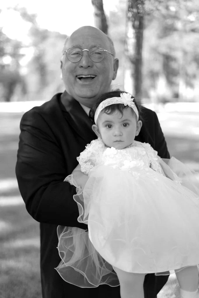 Presented here is Gene Gant, proprietor of Gant Dental Supply Co., accompanied by his granddaughter, Ava.